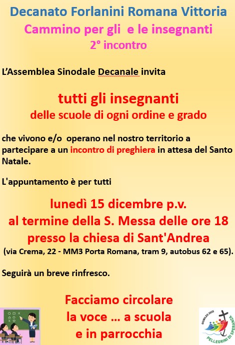 L’Assemblea Sinodale del Decanato Forlanini Romana Vittoria invita tutti/e gli/le insegnanti che vivono e/o operano sul territorio del decanato ad un momento di preghiera in preparazione del S. Natale